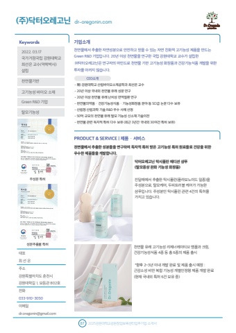 %ub300%ud45c %ucd5c %uc120 %uc740%uc8fc%uc18c%uac15%uc6d0%ud2b9%ubcc4%uc790%uce58%ub3c4 %ucd98%ucc9c%uc2dc %uac15%uc6d0%ub300%ud559%uae38 1, %ubcf4%ub4ec%uad00 802%ud638%uc804%ud654033-910-3050%uc774%uba54%uc77cdr.oregonin@gmail.com%uae30%uc5c5%uc18c%uac1cPRODUCT & SERVICE | %uc81c%ud488%u00b7%uc11c%ube44%uc2a4(%uc8fc)%ub2e5%ud130%uc624%ub808%uace0%ub2cc dr-oregonin.com%ucc9c%uc5f0%ubb3c%uc5d0%uc11c %ucd94%ucd9c%ud55c %uc790%uc5f0%uc131%ubd84%uc73c%ub85c %uc548%uc804%ud558%uace0 %ubbff%uc744 %uc218 %uc788%ub294 %uc790%uc5f0 %uce5c%ud654%uc801 %uace0%uae30%ub2a5%uc131 %uc81c%ud488%uc744 %ub9cc%ub4dc%ub294 Green R&D %uae30%uc5c5%uc785%ub2c8%ub2e4. 20%ub144 %uc774%uc0c1 %ucc9c%uc5f0%ubb3c%uc744 %uc5f0%uad6c%ud55c %uad6d%ub9bd %uac15%uc6d0%ub300%ud559%uad50 %uad50%uc218%uac00 %uc124%ub9bd%ud55c %u321c%ub2e5%ud130%uc624%ub808%uace0%ub2cc%uc740 %uc5f0%uad6c%uc790%uc758 %ub9c8%uc778%ub4dc%ub85c %ucc9c%uc5f0%ubb3c %uae30%ubc18 %uace0%uae30%ub2a5%uc131 %ud654%uc7a5%ud488%uacfc %uac74%uac15%uae30%ub2a5%uc2dd%ud488 %uac1c%ubc1c%uc744 %uc704%ud55c %ud22c%uc790%ub97c %uc544%ub07c%uc9c0 %uc54a%uc2b5%ub2c8%ub2e4. %ucc9c%uc5f0%ubb3c%uc5d0%uc11c %ucd94%ucd9c%ud55c %uc131%ubd84%ub4e4%uc744 %uc5f0%uad6c%ud558%uc5ec %ub3c5%uc790%uc801 %ud2b9%ud5c8 %ubc1b%uc740 %uace0%uae30%ub2a5%uc131 %ud2b9%ud5c8 %uc6d0%ub8cc%ub4e4%ub85c %uac74%uac15%uc744 %uc704%ud55c %uc6b0%uc218%ud55c %uc81c%ud488%ub4e4%uc744 %uac1c%ubc1c%ud569%ub2c8%ub2e4.- %u73fe) %uac15%uc6d0%ub300%ud559%uad50 %uc0b0%ub9bc%ubc14%uc774%uc624%uc18c%uc7ac%uacf5%ud559%uacfc %ucd5c%uc120%uc740 %uad50%uc218- 20%ub144 %uc774%uc0c1 %uad6d%ub0b4%uc678 %ucc9c%uc5f0%ubb3c %uc720%ub798 %uc131%ubd84 %uc5f0%uad6c- 20%ub144 %uc774%uc0c1 %ucc9c%uc5f0%ubb3c %uc720%ub798 %ub09c%uce58%uc131 %uba74%uc5ed%uc9c8%ud658 %uc5f0%uad6c- %ucc9c%uc5f0%ubb3c%uc758%uc57d%ud488%u00b7%uac74%uac15%uae30%ub2a5%uc131%uc2dd%ud488%u00b7%uae30%ub2a5%uc131%ud654%uc7a5%ud488 %ubd84%uc57c %ub4f1 SCI%uae09 %ub17c%ubb38 %ub2e4%uc218 %ubcf4%uc720- %uc0b0%ub9bc%uccad %uc0b0%ub9bc%uacfc%ud559 %uae30%uc220 R&D %uc6b0%uc218 %uc0ac%ub840 %uc120%uc815 - 50%uc5b5 %uaddc%ubaa8%uc758 %ucc9c%uc5f0%ubb3c %uc720%ub798 %ud0c8%ubaa8 %uae30%ub2a5%uc131 %uc2e0%uc18c%uc7ac %uae30%uc220%uc774%uc804- %ucc9c%uc5f0%ubb3c %uad00%ub828 %ub3c5%uc790%uc801 %ud2b9%ud5c8 %ub2e4%uc218 %ubcf4%uc720 (%ucd5c%uadfc 3%ub144%uac04 %uad6d%ub0b4%uc678 30%uc5ec%uac74 %ud2b9%ud5c8 %ubcf4%uc720)Keywords07 2025%uac15%uc6d0%ub300%ud559%uad50%uac15%uc6d0%ucc3d%uc5c5%ubcf4%uc721%uc13c%ud130%uc785%uc8fc%uae30%uc5c5 %uc18c%uac1c%uc11cCEO%uc18c%uac1c2022. 03.17 %uad6d%uac00%uac70%uc810%uad6d%ub9bd %uac15%uc6d0%ub300%ud559%uad50 %ucd5c%uc120%uc740 %uad50%uc218(%uc57d%ud559%ubc15%uc0ac) %uc124%ub9bd%ucc9c%uc5f0%ubb3c%uae30%ubc18%uace0%uae30%ub2a5%uc131 %ubc14%uc774%uc624 %uc18c%uc7acGreen R&D %uae30%uc5c5%ud0c8%ubaa8%uae30%ub2a5%uc131%ub2e5%ud130%uc624%ub808%uace0%ub2cc %ud0c1%uc2dc%ud3f4%ub9b0 %uc5d0%ub514%uc158 %uc0f4%ud478(%ud0c8%ubaa8%uc99d%uc0c1 %uc644%ud654 %uae30%ub2a5%uc131 %ud654%uc7a5%ud488)%uc9c4%ub2ec%ub798%uc5d0%uc11c %ucd94%ucd9c%ud55c %ud0c1%uc2dc%ud3f4%ub9b0(%ud50c%ub77c%ubcf4%ub178%uc774%ub4dc %uc77c%uc885)%uc744 %uc8fc%uc131%ubd84%uc73c%ub85c, %ud0c8%ubaa8%ucf00%uc5b4, %ub450%ud53c%ud2b8%ub7ec%ube14 %ucf00%uc5b4%uac00 %uac00%ub2a5%ud55c %uc0f4%ud478%uc785%ub2c8%ub2e4. %uc8fc%uc131%ubd84%uc778 %ud0c1%uc2dc%ud3f4%ub9b0 %uad00%ub828 4%uac74%uc758 %ud2b9%ud5c8%ub97c %uac00%uc9c0%uace0 %uc788%uc2b5%ub2c8%ub2e4.%ucc9c%uc5f0%ubb3c %uc720%ub798 %uace0%uae30%ub2a5%uc131 %ub9ac%uc81c%ub108%ub808%uc774%ud2f0%ube0c %uc570%ud50c%uacfc %ud06c%ub9bc, %uac74%uac15%uae30%ub2a5%uc131%uc2dd%ud488 4%uc885 %ub4f1 %ucd1d 6%uc885%uc758 %uc81c%ud488 %ucd9c%uc2dc *%ud5a5%ud6c4 2~3%ub144 %uc774%ub0b4 %uac1c%ubc1c %uc644%ub8cc %ubc0f %uc81c%ud488 %ucd9c%uc2dc %uc608%uc815 :%uadfc%uac10%uc18c%uc131 %ube44%ub9cc %ubcf5%ud569 %uae30%ub2a5%uc131 %uac1c%ubcc4%uc778%uc815%ud615 %uc81c%ud488 %uac1c%ubc1c %uc644%ub8cc(%ud604%uc7ac %uad6d%ub0b4%uc678 %ud2b9%ud5c8 6%uac74 %ubcf4%uc720 %uc911)%uc8fc%uc131%ubd84 %ud2b9%ud5c8%uc131%ubd84%ucd94%ucd9c%ubb3c %ud2b9%ud5c8