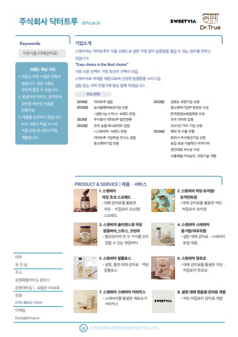 %ub300%ud45c %uc720 %uc9c4 %uc2e4%uc8fc%uc18c%uac15%uc6d0%ud2b9%ubcc4%uc790%uce58%ub3c4 %ucd98%ucc9c%uc2dc%uac15%uc6d0%ub300%ud559%uae38 1, %ubcf4%ub4ec%uad00 1004%ud638%uc804%ud654070-8802-2104%uc774%uba54%uc77cfood@drtrue.kr%uae30%uc5c5%uc18c%uac1cPRODUCT & SERVICE | %uc81c%ud488%u00b7%uc11c%ube44%uc2a4Keywords08 2025%uac15%uc6d0%ub300%ud559%uad50%uac15%uc6d0%ucc3d%uc5c5%ubcf4%uc721%uc13c%ud130%uc785%uc8fc%uae30%uc5c5 %uc18c%uac1c%uc11c%uc8fc%uc694 %uc5f0%ud601%uac00%uacf5%uc2dd%ud488 (%ub300%uccb4%uac10%ubbf8%ub8cc)%uc8fc%uc2dd%ud68c%uc0ac %ub2e5%ud130%ud2b8%ub8e8 drtrue.kr%uc2a4%uc717%ube44%uc544%ub294 %ub2e5%ud130%ud2b8%ub8e8%uc758 %uc2dd%ud488 %ube0c%ub79c%ub4dc%ub85c %uc124%ud0d5 %uac71%uc815 %uc5c6%uc774 %ub2ec%ucf64%ud568%uc744 %uc990%uae38 %uc218 %uc788%ub294 %uad8c%ub9ac%ub97c %uc804%ud558%uace0 %uc788%uc2b5%ub2c8%ub2e4.%u201cEasy choice is the Best choice%u201d%uac00%uc7a5 %uc26c%uc6b4 %uc120%ud0dd%uc774 %uac00%uc7a5 %ucd5c%uc120%uc758 %uc120%ud0dd%uc774 %ub418%uae38, %uc2a4%uc717%ube44%uc544%ub85c %ubd80%uc5cc%uc744 %ucc44%uc6c0%uc73c%ub85c%uc368 %uac74%uac15%ud55c %ub2ec%ucf64%ud568%uc744 %ub204%ub9ac%uc2dc%uae38,%uc124%ud0d5 %uc5c6%ub294 %uc2dd%ud0c1 %ub9cc%ub4e4%uae30%uc5d0 %ud56d%uc0c1 %ud568%uaed8 %ud558%uaca0%uc2b5%ub2c8%ub2e4.1. %uc2a4%uc717%ube44%uc544 %uc800%ub2f9 %ucd08%ucf54 %uc2a4%ud504%ub808%ub4dc %u2022%ub300%uccb4 %uac10%ubbf8%ub8cc%ub97c %ud65c%uc6a9%ud55c %uc800%ub2f9%u00b7%uc800%uce7c%ub85c%ub9ac %ucd08%ucf54%uc7bc/ %uc2a4%ud504%ub808%ub4dc2. %uc2a4%uc717%ube44%uc544 %uc800%ub2f9 %uc720%uc790%uccad/ %uc720%uc790%ubbfc%ud2b8%uccad %u2022%ub300%uccb4 %uac10%ubbf8%ub8cc%ub97c %ud65c%uc6a9%ud55c %uc800%ub2f9%u00b7 %uc800%uce7c%ub85c%ub9ac %uc720%uc790%uccad3. %uc2a4%uc717%ube44%uc544 %uc194%ud2f0%uc564%uc2a4%uc717 %uc800%ub2f9 %ub545%ucf69%ubc84%ud130_%uc2a4%ubb34%uc2a4, %ud06c%ub7f0%uce58 %u2022%ud608%ub2f9%uad00%ub9ac%uc640 %ub9db %ub450 %uac00%uc9c0%ub97c %ubaa8%ub450 %uc7a1%uc744 %uc218 %uc788%ub294 %ub545%ucf69%ubc84%ud1304. %uc2a4%uc717%ube44%uc544 %uc2a4%ud14c%ube44%uc544 %uc6a9%uae30%ud615/%ud30c%uc6b0%uce58%ud615 %u2022%uc124%ud0d5 %ub300%uccb4 %uac10%ubbf8%ub8cc %u2013 %uc2a4%ud14c%ube44%uc544 %ubd84%ub9d0 %uc81c%ud4885. %uc2a4%uc717%ube44%uc544 %uc54c%ub8f0%ub85c%uc2a4 %u2022%uc124%ud0d5, %ubb3c%uc5ff %ub300%uccb4 %uac10%ubbf8%ub8cc %u2013 %uc561%uc0c1 %uc54c%ub8f0%ub85c%uc2a46. %uc2a4%uc717%ube44%uc544 %ud56b%ucd08%ucf54 %u2022%ub300%uccb4 %uac10%ubbf8%ub8cc%ub97c %ud65c%uc6a9%ud55c %uc800%ub2f9%u00b7 %uc800%uce7c%ub85c%ub9ac %ud56b%ucd08%ucf547. %uc2a4%uc717%ube44%uc544 %uc2a4%ud14c%ube44%uc544 %ucee4%ud53c%ubbf9%uc2a4 %u2022%uc2a4%ud14c%ube44%uc544%ub97c %ud65c%uc6a9%ud55c %uc81c%ub85c%uc288%uac00 %ucee4%ud53c%ubbf9%uc2a48. %uc124%ud0d5 %ub300%uccb4 %ub9de%ucda4%ud615 %uac10%ubbf8%ub8cc %uac1c%ubc1c %u2022%uc800%ub2f9,%uc800%uce7c%ub85c%ub9ac %uac10%ubbf8%ub8cc %uac1c%ubc1c%ub2e5%ud130%ud2b8%ub8e8 %uc124%ub9bd%ub18d%uc2dd%ud488%ubca4%ucc98%uc721%uc131%uc0ac%uc5c5 %uc120%uc815<%uc124%ud0d5 0g %uc2a4%ud0a4%ub2c8> %ube0c%ub79c%ub4dc %ub7f0%uce6d%uc8fc%uc2dd%ud68c%uc0ac %ub2e5%ud130%ud2b8%ub8e8 %ubc95%uc778%uc804%ud658%uc804%uad6d %ub18d%ud611 %ud558%ub098%ub85c%ub9c8%ud2b8 %uc785%uc810<%uc2a4%uc717%ube44%uc544> %ube0c%ub79c%ub4dc %ub7f0%uce6d%ub2e5%ud130%ud2b8%ub8e8 %uae30%uc5c5%ubd80%uc124 %uc5f0%uad6c%uc18c %uc124%ub9bd%uc911%uc18c%ubca4%ucc98%uae30%uc5c5 %uc778%uc99d2019%ub1442020%ub144 2021%ub1442022%ub144%uac15%uc6d0%ub3c4 %uc720%ub9dd%uae30%uc5c5 %uc120%uc815%uc911%uc18c%ubca4%ucc98%uae30%uc5c5%ubd80 %uc7a5%uad00%uc0c1 %uc218%uc0c1%ud55c%uad6d%ucc3d%uc5c5%ubcf4%uc721%ud611%ud68c%uc7a5 %uc218%uc0c1%uc804%uad6d %uc774%ub9c8%ud2b8 %uc785%uc8102023%ub144 TIPS %uae30%uc5c5 %uc120%uc815%ud574%uc678 %uccab %uc218%ucd9c %uc9c4%ud589%ucd98%ucc9c%uc2dc %uc6b0%uc218%uccad%ub144%uae30%uc5c5 %uc120%uc815%ub18d%uc5c5 %uacf5%uacf5 %uae30%uc220%ud601%uc2e0 %uc544%uc774%ub514%uc5b4 %uacbd%uc9c4%ub300%ud68c %uc6b0%uc218%uc0c1 %uc218%uc0c1%uc218%ucd9c%uc81c%ud488 FDA%uc2b9%uc778, %ucf54%ud305%uae30%uc220 %uac1c%ubc1c2023%ub1442024%ub144%ube0c%ub79c%ub4dc %ud575%uc2ec %uac00%uce581. %ub9db%uc5c6%ub294 %uc800%ub2f9 %uc2dd%ud488%uc740 %ub9cc%ub4e4%uc9c0 %uc54a%uc2b5%ub2c8%ub2e4. %uc800%ub2f9 %uc2dd%ud488%ub3c4 %ub9db%uc788%uac8c %uc990%uae38 %uc218 %uc788%uc2b5%ub2c8%ub2e4.2. %uaf3c%uaf3c%ud558%uac8c %ub530%uc9c0%uace0, %uc5c4%uaca9%ud558%uac8c %uad00%ub9ac%ud55c %uae68%ub057%ud55c %uc2dd%ud488%uc744 %ub9cc%ub4e4%uc5b4%uc694.3. %uac1c%ubc1c%uc744 %uc678%uc8fc%ud558%uc9c0 %uc54a%uc2b5%ub2c8%ub2e4. %uc6b0%ub9ac %uac00%uc871%uc774 %uba39%uc744 %uac70%ub2c8%uae4c, %uc2dd%ud488 %uc804%ubb38 %uc5f0%uad6c%uc6d0%uc774 %uc9c1%uc811 %uac1c%ubc1c%ud569%ub2c8%ub2e4.