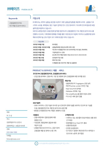 %ub300%ud45c %ud5c8 %uad6c %uc131%uc8fc%uc18c%uac15%uc6d0%ud2b9%ubcc4%uc790%uce58%ub3c4 %ucd98%ucc9c%uc2dc%uac15%uc6d0%ub300%ud559%uae38 1, %ubcf4%ub4ec%uad00 606%ud638%uc804%ud654033-264-1350%uc774%uba54%uc77cfiction@maize.co.kr%uae30%uc5c5%uc18c%uac1cPRODUCT & SERVICE | %uc81c%ud488%u00b7%uc11c%ube44%uc2a4Keywords11 2025%uac15%uc6d0%ub300%ud559%uad50%uac15%uc6d0%ucc3d%uc5c5%ubcf4%uc721%uc13c%ud130%uc785%uc8fc%uae30%uc5c5 %uc18c%uac1c%uc11c%uae30%uc5c5 %uc5f0%ud601%u321c%uba54%uc774%uc988 maize.co.kr%u321c %uba54%uc774%uc988%ub294 %ucd5c%uc801%uc758 %uc2e4%ud5d8%uc2e4 %uacf5%uac04%uc744 %uc870%uc131%ud558%uae30 %uc704%ud55c %uc2e4%ud5d8%uc2e4%ucee8%uc124%ud305%uc744 %uc81c%uacf5%ud574 %ub4dc%ub9ac%uba70, %uc2e4%ud5d8%uc6a9 %uae30%ucd08%uc2dc%uc57d%uacfc %uc18c%ubaa8%ud488, %uc81c%uc57d%uc6d0%ub8cc, %ucca8%ub2e8 %uae30%uc220%uc774 %uc9d1%uc57d%ub41c %uc5f0%uad6c, %uc9c4%ub2e8 %uc7a5%ube44%uae4c%uc9c0 %uae30%ucd08%uacfc%ud559 %uc5f0%uad6c%uc5d0 %ud544%uc694%ud55c %ud1a0%ud0c8%uc194%ub8e8%uc158%uc744 %uc81c%uacf5%ud558%uace0 %uc788%uc2b5%ub2c8%ub2e4. %ub610%ud55c %ud0c4%uc18c%uc911%ub9bd%uc0b0%uc5c5%uc778 %uace4%ucda9%uc0b0%uc5c5%uc5d0 %uc77c%uc775%uc744 %ub2f4%ub2f9%ud558%uace0%uc790 %uace4%ucda9%uc9c8%ubcd1%uc9c4%ub2e8 %ud0a4%ud2b8 %uac1c%ubc1c %ubc0f %ubd84%uc11d%uc11c%ube44%uc2a4%ub97c%uc9c4%ud589%ud558%uace0 %uc788%uc73c%uba70, %uae30%ud6c4%ubcc0%ud654%uc640 %ubcd1%ud574%ucda9 %uadf9%ubcf5%uc744 %ud1b5%ud55c %uc2dd%ub7c9 %uc99d%uc0b0%uacfc %uc790%uae09%uc5d0 %uae30%uc5ec%ud558%uace0 %ub18d%uc0dd%uba85%uc790%uc6d0 %ubd84%uc57c%ud2b9%ud654 %uc720%uc804%uccb4%uae30%uc220 %uc120%ub3c4%uae30%uc5c5%uc774 %ub418%uae30 %uc704%ud574 %ucd5c%uc120%uc744 %ub2e4%ud558%uace0 %uc788%uc2b5%ub2c8%ub2e4.%ubaa8%ub514%ud504TM %uace4%ucda9%uc9c8%ubcd1%uc9c4%ub2e8%ud0a4%ud2b8, %uace4%ucda9%uc9c8%ubcd1 %ubd84%uc11d%uc11c%ube44%uc2a4- %uc0b0%uc5c5%uace4%ucda9 %ubd84%uc57c%uc5d0%uc11c %uace4%ucda9%uc0ac%uc721, %uac00%uacf5 %ubc0f %uc720%ud1b5%uc5d0 %uc788%uc5b4 %uace4%ucda9%uc9c8%ubcd1%uc5d0 %ub300%ud55c %uc720%ubb34%ub97c %ud310%ub2e8%ubcf4%uc720%uae30%uc220%ub825- %ucf54%ub85c%ub098 %ubc14%uc774%ub7ec%uc2a4 %uc9c4%ub2e8%uae30%uc220%uacfc %uc720%uc0ac%ud55c %uc2e4%uc2dc%uac04%uc720%uc804%uc790 %uc99d%ud3ed%uae30%uc220%uc744 %ubcf4%uc720%ud558%uace0 %uc788%uc73c%uba70 %ubcf8 %uae30%uc220%uc744 %uc774%uc6a9 %uace4%ucda9%uc9c8%ubcd1%uc9c4%ub2e8%ud0a4%ud2b8 %uac1c%ubc1c %ubc0f %ubd84%uc11d%uc11c%ube44%uc2a4%ub97c %uc9c4%ud589- %ud604%uc7a5%uc6a9 %uc2e0%uc18d%ud56d%uc6d0%uc9c4%ub2e8%ud0a4%ud2b8 %uac1c%ubc1c%ub3c4 %ubcd1%ud589%ud558%uace0 %uc788%uc74c%uace0%uac1d%ud3b8%uc758%uc0ac%ud56d- %uc0ac%uc721%ud558%uace0 %uc788%ub294 %uc0dd%uc0b0%ubb3c%uc758 %uc815%uc0c1/%ube44%uc815%uc0c1 %uc0c1%ud669 %ud310%ub2e8 %uadfc%uac70%uc81c%uacf5.- %uccad%uc815%uc81c%ud488(Virus-free) %uc778%uc2dd %ud64d%ubcf4- %uc0c1%ud488%uc548%uc815%uc131%uc785%uc99d- %uc548%uc804%ud55c %uacf5%uae09%ub9dd%uad00%ub9ac- %ucd08%uae30%uc9c4%ub2e8%uc2dc %ubc1c%ubcd1%uc774 %ud655%uc778%ub418%uba74 %uc989%uc2dc %ub300%ucc98%ud560 %uc218 %uc788%uc73c%ubbc0%ub85c %ub178%ub3d9%ub825, %uc6d0%uac00%uc808%uac10 %uc0ac%uc6a9%uc6a9%ub3c4- %uace4%ucda9%uc0ac%uc721%uc7a5%uc5d0%uc11c %uc9c8%ubcd1 %ubc1c%uc0dd%uc5d0 %ub300%ud55c %uc815%ud655%ud55c %uc9c4%ub2e8- %uac00%uacf5%uc5c5%uccb4, %uc720%ud1b5%uc5c5%uccb4%uc758 %ud488%uc9c8%uc5d0 %ub300%ud55c %uac1d%uad00%uc801 %uac80%uc99d- %uace4%ucda9%uc744 %ub300%uc0c1%uc73c%ub85c %ud55c %uc5f0%uad6c%uc18c, %uacf5%uacf5%uae30%uad00%uc758 %uace4%ucda9%uc9c8%ubcd1 %uc608%ucc30 %ubc0f %ubc29%uc81c%uc2dc%uc2a4%ud15c %uad6c%ucd95%ud575%uc2ec%uae30%ub2a5- %ubcd1%uc6d0%uccb4 %ud2b9%uc774%uc801 Tragetgene %uc120%uc815 %ub2a5%ub825- %ud2b9%uc774%uc801 primer, probe %ub514%uc790%uc778 %uae30%uc220- Real%u2013time PCR %ucd5c%uc801%ud654- Multiplex %ucd5c%uc801%ud654 %uae30%uc220- Pre-amplification%uc744 %ud1b5%ud55c %ubbfc%uac10%ub3c4 %uc99d%ub300 - %uc57d 3%uc2dc%uac04 %ub0b4%uc5d0 %uacb0%uacfc %uac80%ucd9c%ud68c%uc0ac%ucc3d%ub9bd%uc2e4%ud5d8%uc2e4%ud2b9%ud654%ud615 %ucc3d%uc5c5%uc120%ub3c4%ub300%ud559 %uacfc%uc81c %uc218%ud589%uc0c9%uc18c%uc625%uc218%uc218%ud310%ubcc4%uc6a9 %ud2b9%uc774 SSR %ud504%ub77c%uc774%uba38%ubc0f %uc774%uc758 %uc6a9%ub3c4 %ud2b9%ud5c8%ucde8%ub4dd%uae30%uc5c5%ubd80%uc124%uc5f0%uad6c%uc18c %uc778%uc815%uac15%uc18c%ud2b9%uad6c%uc5f0%uad6c%uac1c%ubc1c R&BD %uc0ac%uc5c5 (2022.10.01-2023.09.30)%uc131%uacfc%uacf5%uc720%uae30%uc5c5 %uc778%uc99d%ubca4%ucc98%uae30%uc5c5 %uc778%uc99d%ub204%uc5d0%uc9c8%ubcd1(2%uc885) %uc9c4%ub2e8%ud0a4%ud2b8 %uac1c%ubc1c %ubc0f %ub0a9%ud488%uc644%ub8cc2021%ub144 08%uc6d4 21%uc77c2021%ub144 05%uc6d4~2022%ub144 01%uc6d42022%ub144 03%uc6d4 10%uc77c2022%ub144 10%uc6d4 28%uc77c2022%ub144 10%uc6d4 01%uc77c2022%ub144 11%uc6d4 22%uc77c 2022%ub144 12%uc6d4 28%uc77c%uace4%ucda9%uc9c8%ubcd1%uc9c4%ub2e8%ud0a4%ud2b8%uc5f0%uad6c%uac1c%ubc1c %ubc0f %ubd84%uc11d%uc11c%ube44%uc2a4