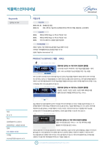 %ub300%ud45c %uc591 %uc624 %uc11d%uc8fc%uc18c%uac15%uc6d0%ud2b9%ubcc4%uc790%uce58%ub3c4 %ucd98%ucc9c%uc2dc%uac15%uc6d0%ub300%ud559%uae38 1, %ubcf4%ub4ec%uad00 805%ud638 %uc804%ud654010-8884-4058%uc774%uba54%uc77cosyang30@kangwon.ac.kr%uae30%uc5c5%uc18c%uac1cPRODUCT & SERVICE | %uc81c%ud488%u00b7%uc11c%ube44%uc2a4%ube45%ud50c%ub809%uc2a4%uc778%ud130%ub0b4%uc154%ub110Keywords14 2025%uac15%uc6d0%ub300%ud559%uad50%uac15%uc6d0%ucc3d%uc5c5%ubcf4%uc721%uc13c%ud130%uc785%uc8fc%uae30%uc5c5 %uc18c%uac1c%uc11c%ub525%ub7ec%ub2dd AI SW %uae30%uc5c5 %uc5f0%ud601%uc815%ubcf4%ud1b5%uc2e0%uc5c5 %ucc3d%uc5c5 %uc804%ubb38, %uacfc%ud559 %ubc0f %uae30%uc220%uc11c%ube44%uc2a4%uc5c5 %ud655%uc7a5(%uc758%ud559 %ubc0f %uc57d%ud559 %uc5f0%uad6c%uac1c%ubc1c, %uc815%ubc00%uc758%ub8cc %uc18c%ud504%ud2b8%uc6e8%uc5b4) 2023. 05. 22.2024. 12.%uc218%uc0c1%ub0b4%uc5ed2024.2025.2025.%ubca0%ud2b8%ub0a8 %ud638%ucc0c%ubbfc Mega-Us %uc5d1%uc2a4%ud3ec %u2018%ud601%uc2e0%uc0c1%u2019 %uc218%uc0c1%ubca0%ud2b8%ub0a8 %ud638%ucc0c%ubbfc Mega-Us %uc5d1%uc2a4%ud3ec %u2018%ud601%uc2e0%uc0c1%u2019 %uc218%uc0c1%ubbf8%uad6d %ub77c%uc2a4%ubca0%uc774%uac70%uc2a4 %uac15%uc6d0%uad00 %uc785%uc810%uae30%uc5c5 %ucc38%uc5ec%uc9c0%uc2dd%uc7ac%uc0b0%ud604%ud669(%ud2b9%ud5c8) %u201c%uc2ec%uc804%ub3c4 %uae30%ubc18 %ubbf8%ub798%uc758 %ub2f9%ub1e8%ubcd1 %ubc1c%uc0dd %uac00%ub2a5%uc131 %uc608%uce21%u201d %uc678 9%uac74 (%uc800%uc791%uad8c) %u201c%ud53c%ubd80%uc9c8%ud658%uc5f0%uacc4 %ub2f9%ub1e8%uc9c4%ub2e8%uc54c%uace0%ub9ac%uc998%u201d %uc678 7%uac74 (%uc0c1%ud45c) %u201cBigFlex International%u201d 1%uac74 %ud55c%ubc29%uc758%ub8cc %ub525%ub7ec%ub2dd AI %uae30%ubc18 %ud53c%ubd80 %uac74%uac15%uad00%ub9ac %ud50c%ub7ab%ud3fc5,000%uba85 10%ub144%uce58 %ube45%ub370%uc774%ud130 %uae30%ubc18 %ud559%uc2b5%ubaa8%ub378%uc744 %ud65c%uc6a9 + %ubdf0%ud2f0 %uad00%ub9ac %uc11c%ube44%uc2a4%ub85c %ud655%uc7a5(%uae30%ub2a5%uc131 %ud654%uc7a5%ud488 %ucd94%ucc9c %uae30%ub2a5 %ud3ec%ud568)%ud53c%ubd80 %uac74%uc120 %ud658%uc790 5000%uba85 10%ub144%uce58 %ub370%uc774%ud130%ub97c %ud559%uc2b5%uc2dc%ud0a8 %ub525%ub7ec%ub2dd %ud559%uc2b5%ubaa8%ub378%uc744 %ucd94%ucd9c%ud558%uc5ec %uc0c8%ub85c%uc6b4 %ud658%uc790%uc758 %ud53c%ubd80 %uc774%ubbf8%uc9c0%ub97c %uc989%uc2dc %ubd84%uc11d%ud558%ub294 %ub525%ub7ec%ub2dd AI %uae30%ubc95%uc744 %ud65c%uc6a9%ud569%ub2c8%ub2e4. %ud5a5%ud6c4 %uc544%ud1a0%ud53c %ub4f1 %uc0dd%ud65c %uc18d%uc5d0%uc11c %uc811%ud558%uac8c %ub418%ub294 %ud53c%ubd80 %uc9c8%ud658 %ubb38%uc81c%ub97c %ud574%uacb0%ud558%uae30%uc704%ud574 %ub354 %ub098%uc740 %ub370%uc774%ud130%ub97c %ud655%ubcf4%ud558%uc5ec %uc6b0%uc218%ud55c %ud559%uc2b5%ubaa8%ub378%uc744 %ucd94%ucd9c%ud568%uc73c%ub85c%uc368 %uc77c%uc0c1 %uc18d%uc5d0%uc11c %ud53c%ubd80%ub97c %ud6a8%uc728%uc801%uc73c%ub85c %uad00%ub9ac%ud560 %uc218 %uc788%ub294 %ub514%uc9c0%ud138 %ud5ec%uc2a4%ucf00%uc5b4 %uc11c%ube44%uc2a4%ub97c %uc2e4%ud604%ud558%uace0%uc790 %ud569%ub2c8%ub2e4. %ud55c%ubc29%uc758%ub8cc %ub525%ub7ec%ub2dd AI %uae30%ubc18 %ub2f9%ub1e8 %uac74%uac15%uad00%ub9ac %ud50c%ub7ab%ud3fc 15%ub144%uc804, 10%ub144%uc804, 7%ub144%uc804, 5%ub144%uc804, 3%ub144%uc804 %uc608%ud6c4 %uc608%uce21%uac80%uc0ac%ub97c %ud1b5%ud574 %uc9c4%ub2e8%ubcf4%ub2e4 %uc608%ubc29%uc744 %ubaa9%uc801%uc73c%ub85c %ud558%ub294 %uc11c%ube44%uc2a4%uce68%uc2b5 %ucc44%ud608 %ubc29%uc2dd%uc740 %uc77c%ubc18%uc778%ub4e4%uc5d0%uac8c %uc2ec%ub9ac%uc801 %uac70%ub9ac%uac10%uc744 %uc8fc%uac8c %ub418%uc5b4 %ud658%uc790%ub4e4%uc758 %uc870%uae30%uc9c4%ub2e8 %uae30%ud68c%ub97c %uc0c1%uc2e4%ud558%uac8c %ub9cc%ub4ed%ub2c8%ub2e4. %uc774 %ubb38%uc81c%ub97c %ud574%uacb0%ud558%uae30 %uc704%ud574 %ube44%uce68%uc2b5 %ubb34%ucc44%ud608 %ubc29%uc2dd%uc73c%ub85c %ub2f9%ub1e8%ub97c %uac80%uc0ac%ud558%ub294 %uae30%uc220%uc744 %uac1c%ubc1c%ud558%uc600%uc2b5%ub2c8%ub2e4. ECG %uc2ec%uc804%ub3c4 %ub370%uc774%ud130%ub97c %uce21%uc815%ud558%uc5ec %ub2f9%ub1e8%ub97c %uc0b4%ud3b4%ubcf4%ub294 %uc218%uce58%ub97c %ucd94%ucd9c%ud558%uace0 15%ub144%uc804, 10%ub144%uc804, 7%ub144%uc804 %ubc29%uc2dd%uc73c%ub85c %ub2f9%ub1e8%uac00 %ubc1c%uc0dd%ud560 %ubbf8%ub798 %uac00%ub2a5%uc131%uc744 %uac80%uc0ac%ud568%uc73c%ub85c%uc368 %uc790%uac00%uc9c4%ub2e8%uc744 %ud1b5%ud574 %ub2f9%ub1e8%ub97c %uc608%ubc29%ud558%ub294 %uac74%uac15%ud55c %uc0b6%uc744 %uc601%uc704%ud560 %uc218 %uc788%ub3c4%ub85d %uc11c%ube44%uc2a4%ud569%ub2c8%ub2e4.%ud55c%ubc29%uc758%ub8cc %ub525%ub7ec%ub2dd AI %uae30%ubc18 %uce58%ub9e4 %uac74%uac15%uad00%ub9ac %ud50c%ub7ab%ud3fc %uc77c%ubc18 %uc790%uac00%uc9c4%ub2e8%uc6a9 %ubb38%uc9c4 %uc11c%ube44%uc2a4 + AI %uae30%ubc18 %ud6c4%uac01%ud14c%uc2a4%ud2b8%ub97c %ud65c%uc6a9%ud55c %uc790%uac00%uc9c4%ub2e8%uc6a9 %ubb38%uc9c4 %uc11c%ube44%uc2a4%uce58%ub9e4 %uac80%uc0ac%ub97c %uc704%ud55c %uc790%uac00%uc9c4%ub2e8%uc6a9 %uc77c%ubc18%ubb38%uc9c4%uc740 %uac74%uac15%ud55c %uc0ac%ub78c%uc5d0%uac8c%ub294 %ub3c4%uc6c0%uc774 %ub418%uc9c0%ub9cc %uc2e4%uc81c %uce58%ub9e4%ub97c %uc553%ub294 %ubd84%ub4e4%uc740 %uc790%uac00%uc9c4%ub2e8%uc774 %ubd88%uac00%ub2a5%ud569%ub2c8%ub2e4. %ub610%ud55c %uc77c%ubc18%ubb38%uc9c4%uc740 %uc6b0%uc218%uc131%uc5d0%ub3c4 %ubd88%uad6c%ud558%uace0 %uadfc%uc6d0%uc801%uc778 %uc815%ud655%ub3c4%uac00 %ub5a8%uc5b4%uc9c0%uae30 %ub54c%ubb38%uc5d0 %uadf8 %ub300%uc548%uc73c%ub85c %ud6c4%uac01 %ud14c%uc2a4%ud2b8%ub97c %ud1b5%ud574 %ubcf4%ub2e4 %uc815%ud655%ud55c %uce58%ub9e4 %uc790%uac00%uc9c4%ub2e8 %uc11c%ube44%uc2a4%ub97c %uc81c%uacf5%ud558%uace0%uc790 %ud569%ub2c8%ub2e4. %ud2b9%ud788 %ud55c%uad6d%uc778%ub4e4%uc5d0%uac8c %ub9de%ub294 %ud55c%uad6d%ud615 %ud5a5%uc744 %uc120%ubcc4%ud558%uace0 %uc790%uc2e0%uc744 %uc704%ud55c %uac1c%uc778%ub9de%ucda4%ud615 %ud6c4%uac01%ud14c%uc2a4%ud2b8 %uae30%ubc95%uc744 %uc0ac%uc6a9%ud569%ub2c8%ub2e4.