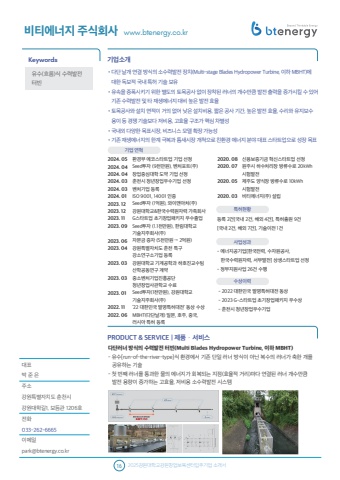 %ub300%ud45c %ubc15 %uc900 %uc740%uc8fc%uc18c%uac15%uc6d0%ud2b9%ubcc4%uc790%uce58%ub3c4 %ucd98%ucc9c%uc2dc%uac15%uc6d0%ub300%ud559%uae381, %ubcf4%ub4ec%uad00 1206%ud638%uc804%ud654033-262-6665%uc774%uba54%uc77cpark@btenergy.co.kr%uae30%uc5c5%uc18c%uac1cPRODUCT & SERVICE | %uc81c%ud488%u00b7%uc11c%ube44%uc2a4Keywords16 2025%uac15%uc6d0%ub300%ud559%uad50%uac15%uc6d0%ucc3d%uc5c5%ubcf4%uc721%uc13c%ud130%uc785%uc8fc%uae30%uc5c5 %uc18c%uac1c%uc11c%uae30%uc5c5 %uc5f0%ud601%uc720%uc218(%ud750%ub984)%uc2dd %uc218%ub825%ubc1c%uc804%ud130%ube48%ube44%ud2f0%uc5d0%ub108%uc9c0 %uc8fc%uc2dd%ud68c%uc0ac www.btenergy.co.kr%u2022%ub2e4%ub2e8 %ub0a0%uac1c %uc5f0%uacb0 %ubc29%uc2dd%uc758 %uc18c%uc218%ub825%ubc1c%uc804 %uc7a5%uce58(Multi-stage Blades Hydropower Turbine, %uc774%ud558 MBHT)%uc5d0 %ub300%ud55c %ub3c5%ubcf4%uc801 %uad6d%ub0b4 %ud2b9%ud5c8 %uae30%uc220 %ubcf4%uc720%u2022%uc720%uc18d%uc744 %uc99d%ud3ed%uc2dc%ud0a4%uae30 %uc704%ud55c %ubcc4%ub3c4%uc758 %ud1a0%ubaa9%uacf5%uc0ac %uc5c6%uc774 %uc7a5%ucc29%ub41c %ub7ec%ub108%uc758 %uac1c%uc218%ub9cc%ud07c %ubc1c%uc804 %ucd9c%ub825%uc744 %uc99d%uac00%uc2dc%ud0ac %uc218 %uc788%uc5b4 %uae30%uc874 %uc218%ub825%ubc1c%uc804 %ubc0f %ud0c0 %uc7ac%uc0dd%uc5d0%ub108%uc9c0 %ub300%ube44 %ub192%uc740 %ubc1c%uc804 %ud6a8%uc728%u2022%ud1a0%ubaa9%uacf5%uc0ac%uc640 %uc124%uce58 %uba74%uc801%uc774 %uac70%uc758 %uc5c6%uc5b4 %ub0ae%uc740 %uc124%uce58%ube44%uc6a9, %uc9e7%uc740 %uacf5%uc0ac %uae30%uac04, %ub192%uc740 %ubc1c%uc804 %ud6a8%uc728, %uc218%ub9ac%uc640 %uc720%uc9c0%ubcf4%uc218 %uc6a9%uc774 %ub4f1 %uacbd%uc7c1 %uae30%uc220%ubcf4%ub2e4 %uc800%ube44%uc6a9, %uace0%ud6a8%uc728 %uad6c%uc870%uac00 %ud575%uc2ec %ucc28%ubcc4%uc131%u2022%uad6d%ub0b4%uc678 %ub2e4%uc591%ud55c %ubaa9%ud45c%uc2dc%uc7a5, %ube44%uc988%ub2c8%uc2a4 %ubaa8%ub378 %ud655%uc7a5 %uac00%ub2a5%uc131%u2022%uae30%uc874 %uc7ac%uc0dd%uc5d0%ub108%uc9c0%uc758 %ud55c%uacc4 %uadf9%ubcf5%uacfc %ud2c8%uc0c8%uc2dc%uc7a5 %uac1c%ucc99%uc73c%ub85c %uce5c%ud658%uacbd %uc5d0%ub108%uc9c0 %ubd84%uc57c %ub300%ud45c %uc2a4%ud0c0%ud2b8%uc5c5%uc73c%ub85c %uc131%uc7a5 %ubaa9%ud45c%ub2e4%ub2e8%ub7ec%ub108 %ubc29%uc2dd%uc758 %uc218%ub825%ubc1c%uc804 %ud130%ube48(Multi Blades Hydropower Turbine, %uc774%ud558 MBHT)- %uc720%uc218[run-of-the-river-type]%uc2dd %ud658%uacbd%uc5d0%uc11c %uae30%uc874 %ub2e8%uc77c %ub7ec%ub108 %ubc29%uc2dd%uc774 %uc544%ub2cc %ubcf5%uc218%uc758 %ub7ec%ub108%uac00 %ucd95%ud55c %uac1c%ub97c %uacf5%uc720%ud558%ub294 %uae30%uc220- %uccab %ubc88%uc9f8 %ub7ec%ub108%ub97c %ud1b5%uacfc%ud55c %ubb3c%uc758 %uc5d0%ub108%uc9c0%uac00 %ud68c%ubcf5%ub418%ub294 %uc9c0%uc810(%ud6a8%uc728%uc801 %uac70%ub9ac)%ub9c8%ub2e4 %uc5f0%uacb0%ub41c %ub7ec%ub108 %uac1c%uc218%ub9cc%ud07c %ubc1c%uc804 %uc6a9%ub7c9%uc774 %uc99d%uac00%ud558%ub294 %uace0%ud6a8%uc728, %uc800%ube44%uc6a9 %uc18c%uc218%ub825%ubc1c%uc804 %uc2dc%uc2a4%ud15c%ud658%uacbd%ubd80 %uc5d0%ucf54%uc2a4%ud0c0%ud2b8%uc5c5 %uae30%uc5c5 %uc120%uc815Seed%ud22c%uc790 (9%ucc9c%ub9cc%uc6d0), %ubca4%ucc98%ud3ec%ud2b8(%uc8fc)%ucc3d%uc5c5%uc911%uc2ec%ub300%ud559 %ub3c4%uc57d %uae30%uc5c5 %uc120%uc815%ucd98%ucc9c%uc2dc %uccad%ub144%ucc3d%uc5c5%uc6b0%uc218%uae30%uc5c5 %uc120%uc815%ubca4%ucc98%uae30%uc5c5 %ub4f1%ub85dISO 9001, 14001 %uc778%uc99dSeed%ud22c%uc790 (1%uc5b5%uc6d0), %uc640%uc774%uc564%uc544%ucc98(%uc8fc)%uac15%uc6d0%ub300%ud559%uad50&%ud55c%uad6d%uc218%ub825%uc6d0%uc790%ub825 %uac00%uc871%ud68c%uc0acG%uc2a4%ud0c0%ud2b8%uc5c5 %ucd08%uae30%ucc3d%uc5c5%ud328%ud0a4%uc9c0 %uc6b0%uc218%uc878%uc5c5Seed%ud22c%uc790 (1.1%ucc9c%ub9cc%uc6d0), %ud55c%ub9bc%ub300%ud559%uad50 %uae30%uc220%uc9c0%uc8fc%ud68c%uc0ac(%uc8fc)%uc790%ubcf8%uae08 %uc99d%uc790 (5%ucc9c%ub9cc%uc6d0 %u2192 2%uc5b5%uc6d0)%uac15%uc6d0%ud2b9%ubcc4%uc790%uce58%ub3c4 %ucd98%ucc9c %ud2b9%uad6c %uac15%uc18c%uc5f0%uad6c%uc18c%uae30%uc5c5 %ub4f1%ub85d%uac15%uc6d0%ub300%ud559%uad50 %uae30%uacc4%uacf5%ud559%uacfc %ud558%ud638%uc9c4%uad50%uc218%ud300 %uc0b0%ud559%uacf5%ub3d9%uc5f0%uad6c %uacc4%uc57d%uc911%uc18c%ubca4%ucc98%uae30%uc5c5%uc9c4%ud765%uacf5%ub2e8 %uccad%ub144%ucc3d%uc5c5%uc0ac%uad00%ud559%uad50 %uc218%ub8ccSeed%ud22c%uc790(1%ucc9c%ub9cc%uc6d0), %uac15%uc6d0%ub300%ud559%uad50 %uae30%uc220%uc9c0%uc8fc%ud68c%uc0ac(%uc8fc)%u201822 %ub300%ud55c%ubbfc%uad6d %ubc1c%uba85%ud2b9%ud5c8%ub300%uc804%u2019 %ub3d9%uc0c1 %uc218%uc0c1MBHT(%ub2e4%ub2e8%ub0a0%uac1c) %uc77c%ubcf8, %ud638%uc8fc, %uc911%uad6d, %ub7ec%uc2dc%uc544 %ud2b9%ud5c8 %ub4f1%ub85d2024. 052024. 042024. 042024. 032024. 032024. 012023. 122023. 122023. 112023. 092023. 062023. 042023. 032023. 032023. 012022. 112022. 06%ub4f1%ub85d 2%uac74[%uad6d%ub0b4 2%uac74, %ud574%uc678 4%uac74], %ud2b9%ud5c8%ucd9c%uc6d0 9%uac74[%uad6d%ub0b4 2%uac74, %ud574%uc678 7%uac74], %uae30%uc220%uc774%uc804 1%uac742020. 082020. 072020. 052020. 03%uc2e0%uc6a9%ubcf4%uc99d%uae30%uae08 %ud601%uc2e0%uc2a4%ud0c0%ud2b8%uc5c5 %uc120%uc815%uc6d0%uc8fc%uc2dc %ud558%uc218%ucc98%ub9ac%uc7a5 %ubc29%ub958%uc218%ub85c 20kWh%uc2dc%ud5d8%ubc1c%uc804%uc81c%uc8fc%ub3c4 %uc591%uc2dd%uc7a5 %ubc29%ub958%uc218%ub85c 10kWh%uc2dc%ud5d8%ubc1c%uc804%ube44%ud2f0%uc5d0%ub108%uc9c0(%uc8fc) %uc124%ub9bd%ud2b9%ud5c8%ud604%ud669- %uc5d0%ub108%uc9c0%uacf5%uae30%uc5c5[%ud55c%uad6d%uc804%ub825, %uc218%uc790%uc6d0%uacf5%uc0ac, %ud55c%uad6d%uc218%ub825%uc6d0%uc790%ub825, %uc11c%ubd80%ubc1c%uc804] %uc0c1%uc0dd%uc2a4%ud0c0%ud2b8%uc5c5 %uc120%uc815- %uc815%ubd80%uc9c0%uc6d0%uc0ac%uc5c5 26%uac74 %uc218%ud589%uc0ac%uc5c5%uc131%uacfc - 2022 %ub300%ud55c%ubbfc%uad6d %ubc1c%uba85%ud2b9%ud5c8%ub300%uc804 %ub3d9%uc0c1 - 2023 G-%uc2a4%ud0c0%ud2b8%uc5c5 %ucd08%uae30%ucc3d%uc5c5%ud328%ud0a4%uc9c0 %uc6b0%uc218%uc0c1 - %ucd98%ucc9c%uc2dc %uccad%ub144%ucc3d%uc5c5%uc6b0%uc218%uae30%uc5c5%uc218%uc0c1%uc774%ub825