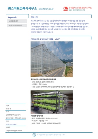 %ub300%ud45c %uae40 %uc131 %ud6c8%uc8fc%uc18c%uac15%uc6d0%ud2b9%ubcc4%uc790%uce58%ub3c4 %ucd98%ucc9c%uc2dc%uac15%uc6d0%ub300%ud559%uae38 1, %uacf5%ud5596%ud638%uad00 206%ud638%uc804%ud654033-257-2900%uc774%uba54%uc77c shgim4654@gmail.com%uae30%uc5c5%uc18c%uac1cPRODUCT & SERVICE | %uc81c%ud488%u00b7%uc11c%ube44%uc2a4Keywords17 2025%uac15%uc6d0%ub300%ud559%uad50%uac15%uc6d0%ucc3d%uc5c5%ubcf4%uc721%uc13c%ud130%uc785%uc8fc%uae30%uc5c5 %uc18c%uac1c%uc11c%uc2a4%ub9c8%ud2b8%ud31c %uc124%uacc4%uc2dc%uacf5 %ubc0f %uae30%uc790%uc7ac %uc0dd%uc0b0%u321c%uc2a4%ub9c8%ud2b8%uac74%ucd95%uc0ac%uc0ac%ubb34%uc18c%ub294 %uc804%ubb38 %uc628%uc2e4 %uc124%uacc4%uc640 %uc778%ud5c8%uac00 %ud589%uc815%uc5c5%ubb34 %ucc98%ub9ac %uacbd%ud5d8%uc744 %uac16%ucd98 %uc804%ubb38 %uc124%uacc4 %uc5c5%uccb4%uc785%ub2c8%ub2e4. %uad6d%ub0b4 %uc2e4%uc815%uc5d0 %ub9de%ub294 %uc2a4%ub9c8%ud2b8%ud31c %ubaa8%ub378%uc744 %uac1c%ubc1c%ud558%uba70, shop drawing%uc774 %uac00%ub2a5%ud55c %uc720%uc77c %uc5c5%uccb4%ub85c %ub2e4%uc218 %uc81c%ud488 %ubc0f %ud2b9%ud5c8%ud654%ub97c %ucd94%uc9c4%ud558%uace0 %uc788%uc2b5%ub2c8%ub2e4. %uc790%uccb4 %uc81c%uc791%uc73c%ub85c %uc218%uc785%uc790%uc7ac%ub97c %ub300%uccb4%ud574 %ube44%uc6a9%uc744 %uc808%uac10%ud558%uace0, %uc790%ub3d9%ud654 %uc124%ube44%ub97c %ud1b5%ud574 %ud488%uc9c8%uacfc %uc0dd%uc0b0%uc131%uc744 %ub192%uc774%uba70, %ud134%ud0a4 %uc2dc%uc2a4%ud15c%uacfc %uc720%ud1b5 %ud611%uc57d%uc744 %ud1b5%ud574 %uc0dd%uc0b0%uc790%ub4e4%uc758 %uc548%uc815%uc801%uc778 %uc720%ud1b5%uae4c%uc9c0 %uc9c0%uc6d0 %uac00%ub2a5%ud569%ub2c8%ub2e4.%u321c%uc2a4%ub9c8%ud2b8%uac74%ucd95%uc0ac%uc0ac%ubb34%uc18c smartarchi.co.kr%uacf5%uacf5%uc784%ub300%ud615 %uc2a4%ub9c8%ud2b8%ud31c %uc720%ub9ac%uc628%uc2e4 %uc124%uacc4/%uc2dc%uacf5 - %uc704%uce58 : %uacbd%uc0c1%ub0a8%ub3c4 %ubc00%uc591%uc2dc (2022.09~)- %uc2dc%uacf5%uaddc%ubaa8 : %uc628%uc2e4 11,242%u33a1- %ub0b4%uc6a9 : %uc628%uc2e4 %uc678%uc7a5%uc7acPMMA, PC/ %uc628%uc2e4 %ucc9c%ucc3d%uac1c%ud3d0, %uc790%ub3d9%uc81c%uc5b4, %ud658%uacbd%uc81c%uc5b4 %ub4f1%uc2dd%ubb3c%uacf5%uc7a5 %uc124%uacc4/%uc2dc%uacf5 - %uc704%uce58 : %uac15%uc6d0%ud2b9%ubcc4%uc790%uce58%ub3c4 %ucd98%ucc9c%uc2dc (2025.06~)- %uc2dc%uacf5%uaddc%ubaa8 : %uc2dd%ubb3c%uacf5%uc7a5 72%u33a1- %ub0b4%uc6a9 : %uc804%uc6a9%ub809, LED%uc124%uce58, %uc790%ub3d9%uc81c%uc5b4, %ud658%uacbd%uc81c%uc5b4 %ub4f1