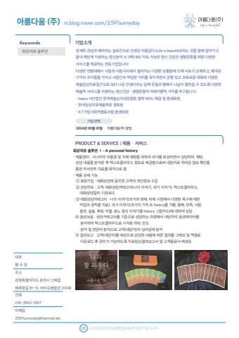 %ub300%ud45c %ud669 %uc218 %uacbd%uc8fc%uc18c%uac15%uc6d0%ud2b9%ubcc4%uc790%uce58%ub3c4 %ucd98%ucc9c%uc2dc %uc2e0%ubd81%uc74d%ubc30%ud6c4%ub839%uae38 81-10, %ubc14%uc774%uc624%uc735%ud569%uad00 204%ud638%uc804%ud654010-2902-2597%uc774%uba54%uc77c2597sunnyday@hanmail.net%uae30%uc5c5%uc18c%uac1cPRODUCT & SERVICE | %uc81c%ud488%u00b7%uc11c%ube44%uc2a4Keywords25 2025%uac15%uc6d0%ub300%ud559%uad50%uac15%uc6d0%ucc3d%uc5c5%ubcf4%uc721%uc13c%ud130%uc785%uc8fc%uae30%uc5c5 %uc18c%uac1c%uc11c%uae30%uc5c5 %uc5f0%ud601%ud68c%uc0c1%uce58%uc720 %uc194%ub8e8%uc158%uc544%ub984%ub2e4%uc6c0 (%uc8fc) m.blog.naver.com/2597sunnyday%uc12c%uc138%ud55c %uad00%uc2ec%uacfc %ubc30%ub824%ub77c%ub294 %uc2ac%ub85c%uac74%uc73c%ub85c %uc778%uc0dd%uc740 %uc544%ub984%ub2f5%ub2e4.(Life is beautiful)%ub77c%ub294 %uac83%uc744 %ud568%uaed8 %uc54c%uc544%uac00%uace0, %ub05d%ub0b4 %uae68%ub2eb%uac8c %uc9c0%uc6d0%ud558%ub294 %uc815%uc2e0%ubd84%uc11d%u2219%ub1cc%u2219%uacfc%ud559%u2219BIO %uc9c0%uc18d %uac00%ub2a5%ud55c %uc815%uc2e0 %uac74%uac15%uacfc %uc0dd%uba85%uc874%uc911%uc744 %uc704%ud55c %ub2e4%uc591%ud55c %uc11c%ube44%uc2a4%ub97c %uc81c%uacf5%ud558%ub294 %uc804%ubb38%uae30%uc5c5%uc785%ub2c8%ub2e4.%ub2e4%uc591%ud55c %uc5f0%ub839%ub300%uc5d0%uc11c %uc0ac%ub78c%uacfc %uc0ac%ub78c%uc0ac%uc774%uc5d0%uc11c %ubc8c%uc5b4%uc9c0%ub294 %ub2e4%uc591%ud55c %uc0c1%ud669%ub4e4%uc5d0 %uc758%ud574 %uc11c%ub85c%uac00 %uc624%ud574%ud558%uace0, %uc65c%uace1%ub41c %uae30%uc5b5%uc758 %uc870%uac01%ub4e4%uc744 %uac00%uc9c0%uace0 %uc0ac%ub78c%uac04%uc758 %uc801%ub2f9%ud55c %uac70%ub9ac%ub97c %uc720%uc9c0%ud558%uba74%uc11c %uade0%ud615 %uc788%uace0 %uc870%ud654%ub85c%uc6b4 %ub300%ud654%uc640 %ub2e4%uc591%ud55c %uc608%uc220%uc784%uc0c1%uce58%ub8cc%uc811%uadfc%uc73c%ub85c %ubcf4%ub2e4 %ub098%uc740 %uc778%uc0dd%uc774%ub77c%ub294 %uae38%uc5d0 %uc6c3%uc74c%uacfc %ud589%ubcf5%uc774 %ub098%ub0a0%uc774 %ud3bc%uccd0%uc9c8 %uc218 %uc788%ub3c4%ub85d %ub2e4%uc591%ud55c %uc608%uc220%uc801 %uc11c%ube44%uc2a4%ub97c %uc9c0%uc6d0%ud558%ub294 %uc815%uc2e0%uac74%uac15 %u2219 %uc0dd%uba85%uc874%uc911%uc758 %ubbf8%ub798%uc9c0%ud5a5%uc801 %uac00%uce58%ub97c %ucd94%uad6c%ud569%ub2c8%ub2e4.- kapca %uc0ac%ub2e8%ubc95%uc778 %ud55c%uad6d%uc608%uc220%uc2ec%ub9ac%uc0c1%ub2f4%ud611%ud68c %ud611%ub825 MOU %uccb4%uacb0 %ubc0f %ud3c9%uc0dd%ud68c%uc6d0, - %ud55c%uad6d%uc784%uc0c1%uce58%uc720%uc608%uc220%ud559%ud68c %uc815%ud68c%uc6d0 - ICT%uae30%uc5c5%uc0ac%ud68c%uc801%ud611%ub3d9%uc870%ud569 %ud3c9%uc0dd%ud68c%uc6d0%uc544%ub984%ub2e4%uc6c0(%uc8fc) %ucc3d%uc5c5 %ud68c%uc0c1%uce58%uc720 %uc194%ub8e8%uc158 %u2160 - A personal history- %uc81c%ud488%uc815%uc758 : %uc2dc%ub2c8%uc5b4%uc758 %uc6b0%uc6b8%uc99d %ubc0f %uce58%ub9e4 %uc608%ubc29%uc744 %uc704%ud558%uc5ec %uacfc%uac70%ub97c %ud68c%uc0c1%ud558%uba74%uc11c %uc0c1%ub2f4%ud558%uba70, %ud574%ub2f9 %uc0c1%ub2f4 %ub0b4%uc6a9%uc744 %ubd84%uc11d%ud55c %ud6c4 %ud14d%uc2a4%ud2b8%ud074%ub77c%uc6b0%ub4dc %uc815%ubcf4%ub85c %uc81c%uacf5%ud568%uc73c%ub85c%uc368 %ub0b4%ub2f4%uc790%ub85c %ud558%uc5ec%uae08 %uc815%ubcf4 %ud655%uc778%uc744 %ud1b5%ud55c %uc790%uc11c%uc804%uc801 %uce58%ub8cc%ub97c %ubaa9%uc801%uc73c%ub85c %ud568- %uc81c%ud488 %uc0c1%uc138 %uae30%ub2a5%u2460 %ud68c%uc6d0%uac00%uc785 : %ub300%ud654%uc0c1%ub2f4%uc5d0 %ub3d9%uc758%ud55c %uace0%uac1d%uc758 %uac1c%uc778%uc815%ubcf4 %uc218%uc9d1%u2461 %uc0c1%ub2f4%ucc28%ud2b8 : %uace0%uac1d, %ub300%ud654%uc0c1%ub2f4%uce74%ud14c%uace0%ub9ac(%ub098%uc758 %uc774%uc57c%uae30, %uacfc%uac70 %uc774%uc57c%uae30), %ud14d%uc2a4%ud2b8%ud074%ub77c%uc6b0%ub4dc, %ub300%ud654%uc0c1%ub2f4%uc77c%uc790, %ub2e4%uc6b4%ub85c%ub4dc%u2462 %ub300%ud654%uc0c1%ub2f4%uce74%ud14c%uace0%ub9ac : %ub098%uc758 %uc774%uc57c%uae30(%uacfc%uac70%uc640 %ud604%uc7ac, %ubbf8%ub798 %uc2dc%uc810%uc5d0%uc11c %ub2e4%uc591%ud55c %uc695%uad6c%uc5d0 %ub300%ud55c %uc5b5%uc555%uacfc %uacbd%uc9c1%uc744 %uce58%ub8cc), %uacfc%uac70 %uc774%uc57c%uae30(%uacfc%uac70%uc758 %uae30%uc5b5 %uc18d history%ub97c %uae30%uc068, %ud589%ubcf5, %ub9cc%uc871, %uc0ac%ub791, %ucda9%ub9cc, %uc2ac%ud514, %ud6c4%ud68c, %uc5b5%uc6b8, %ubd84%ub178 %ub4f1%uc758 %uc774%uc57c%uae30%ub97c history %uadf8%ub9bc%uce74%ub4dc)%uc5d0 %ub300%ud558%uc5ec %uc0c1%ub2f4%u2463 %uc74c%uc131%ub179%uc74c : %uc0c1%ub2f4%uce74%ud14c%uace0%ub9ac%ub97c %uae30%uc900%uc73c%ub85c %uc0c1%ub2f4%ud558%ub294 %uacfc%uc815%uc5d0%uc11c %ub0b4%ub2f4%uc790%uc758 %uc74c%uc131%ub370%uc774%ud130%ub97c %ubd84%uc11d%ud558%uc5ec %ud14d%uc2a4%ud2b8%ud074%ub77c%uc6b0%ub4dc%ub85c %uc2dc%uac01%ud654 %ud558%uba70, %ube48%ub3c4 %ubd84%uc11d %ubc0f %uc5f0%uad00%uc5b4 %ubd84%uc11d%uc73c%ub85c %uace0%uac1d(%ub0b4%ub2f4%uc790)%uc758 %uc2ec%ub9ac%uc0c1%ud0dc %ubd84%uc11d%u2464 %uacb0%uacfc%ubcf4%uace0 : %uace0%uac1d(%ub0b4%ub2f4%uc790)%ub97c %ub300%uc0c1%uc73c%ub85c %uc0c1%ub2f4%ud55c %ub0b4%uc6a9%uc5d0 %ub530%ub978 %uacb0%uacfc%ub97c %uadf8%ub798%ud504 %ubc0f %uc5d1%uc140%ub85c %ub2e4%uc6b4%ub85c%ub4dc %ud6c4 %uad00%ub9ac%uac00 %uac00%ub2a5%ud558%ub3c4%ub85d %uce58%ub8cc%uc784%uc0c1%uacb0%uacfc%ubcf4%uace0%uc11c %ubc0f %uace0%uac1d%uc6a9%ubb38%uc11c %ub808%ud3ec%ud3052024%ub144 05%uc6d4 01%uc77c