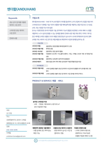 %ub300%ud45c %uae40 %uc9c4 %ucca0%uc8fc%uc18c%uac15%uc6d0%ud2b9%ubcc4%uc790%uce58%ub3c4 %ucd98%ucc9c%uc2dc %uc2e0%ubd81%uc74d%ubc30%ud6c4%ub839%uae38 81-10, %ubc14%uc774%uc624%uc735%ud569%uad00 201%ud638%uc804%ud654010-3134-4478%uc774%uba54%uc77canduham.korea@gmail.com%uae30%uc5c5%uc18c%uac1cPRODUCT & SERVICE | %uc81c%ud488%u00b7%uc11c%ube44%uc2a4Keywords26 2025%uac15%uc6d0%ub300%ud559%uad50%uac15%uc6d0%ucc3d%uc5c5%ubcf4%uc721%uc13c%ud130%uc785%uc8fc%uae30%uc5c5 %uc18c%uac1c%uc11c%uae30%uc5c5 %uc5f0%ud601%uc13c%uc2f1 %uac10%uc9c0 %uc7a5%uce58%ub97c %uc774%uc6a9%ud55c%ub370%uc774%ud130 %uc218%uc9d1 %uc7a5%uce58%uc564%ub354%ud568(ANDUHAM)%uc564%ub354%ud568(ANDUHAM) - %u2018AND%u2019 %uc640 %u2018PLUS(%ub354%ud568)%u2019%uc758 %uc758%ubbf8%ub97c %ud569%uc131%ud558%uc5ec 2,3%ucc28 %uc0b0%uc5c5%uc5d0 4%ucc28 %uc0b0%uc5c5%uc744 %ub354%ud568 %uc758%ubbf8%uc2a4%ub9c8%ud2b8%ud31c %ubc0f ICT %uc735%ubcf5%ud569 %uae30%uc220 %uae30%ubc18%uc758 %ubaa8%ub4c8%ud615 %uc2dd%ubb3c %uc7ac%ubc30 %uc194%ub8e8%uc158%uc744 %uac1c%ubc1c%ud558%ub294 %ucc3d%uc5c5%uae30%uc5c5%uc73c%ub85c, %ub3c4%uc2dc%ub18d%uc5c5, %uad50%uc721, %uadc0%ub18d %uc2dc%uc7a5%uc744 %uc8fc%uc694 %ud0c0%uac9f %uc124%uc815%ub2f9%uc0ac%ub294 %ub2e4%uc591%ud55c %ud658%uacbd %uc13c%uc11c%uc640 %uc790%ub3d9%ud654 %uae30%uc220, %uc6d0%uaca9%uc81c%uc5b4 %uae30%ub2a5%uc774 %ud1b5%ud569%ub41c %ud45c%uc900%ud654%ub41c %uc2a4%ub9c8%ud2b8 %uc7ac%ubc30 %uc2dc%uc2a4%ud15c%uc744 %uac1c%ubc1c%ud558%uc5ec, %ub204%uad6c%ub098 %uc27d%uac8c %uc6b4%uc601%ud560 %uc218 %uc788%ub294 %u2018%uc644%uc81c%ud488 %ud615%ud0dc%uc758 %ucee8%ud14c%uc774%ub108%ud31c%u2019 %uc81c%uacf5 %ubaa9%ud45c %ud2b9%ud788, %uc9c0%uc5ed%uc758 %uae30%ud6c4 %ubc0f %uacf5%uac04 %uc81c%uc57d%uc744 %uace0%ub824%ud55c %ubaa8%ub4c8%ud615 %uad6c%uc870%uc758 %uc81c%ud488%uc740 %ud604%uc7a5 %uc911%uc2ec%uc758 %uc2e4%uc218%uc694%uc790 %ub2c8%uc988%uc5d0 %ucd5c%uc801%ud654%ub418%uc5b4 %uc788%uc73c%uba70, %ud5a5%ud6c4 %uad50%uc721%uc6a9 %ud0a4%ud2b8, %ub370%uc774%ud130 %uc218%uc9d1 %uc7a5%uce58 %ub4f1 %uacc4%uc5f4 %uc81c%ud488%uc73c%ub85c %ud655%uc7a5%ud558%uc5ec %uc0ac%uc5c5%ud654 %ubc94%uc704%ub97c %ub113%ud600%uac00%ub294 %uc911%ubd84%ubb34%uacbd %uc2a4%ub9c8%ud2b8%ud31c %ud0a4%ud2b8%u2013 %uad50%uc721%u00b7%uac00%uc815%uc6a9 / %uc5d0%uc5b4%ub85c%ud3ec%ub2c9%uc2a4%ubc29%uc2dd%uacfc IoT %uc13c%uc11c %uc790%ub3d9%uc81c%uc5b4 %uc801%uc6a9%uac15%uc6d0%ub300%ud559%uad50 %ucc3d%uc5c5%uc9c4%ud765%uc6d0 %uc608%ube44%ucc3d%uc5c5%ud328%ud0a4%uc9c0 %uc120%uc815%uc564%ub354%ud568 %uc124%ub9bd%uac15%uc6d0%ub300%ud559%uad50 %ucc3d%uc5c5 %ub3d9%uc544%ub9ac %ud65c%ub3d9%u300c%uac15%uc6d0%ucd98%ucc9c %uac15%uc18c%ud2b9%uad6c %uc774%ub178%ud3f4%ub9ac%uc2a4%ucea0%ud37c%uc2a4 %uc0ac%uc5c5%u300d %uc2dc%uc81c%ud488 %uace0%ub3c4%ud654 %uc9c0%uc6d0 %ucd08%uae30%ucc3d%uc5c5%uae30%uc5c5 %uc120%uc815%uac15%uc6d0%ub300%ud559%uad50 %ubcf4%uc721%uc13c%ud130 %uc785%uc8fc(%ubc14%uc774%uc624%uc735%ud569%uad00)%uc804%ubb38%uac74%uc124%uc5c5 %uba74%ud5c8 %ucde8%ub4dd %uc608%uc815 (%uae08%uc18d%ucc3d%ud638%u00b0%uc9c0%ubd95%uac74%ucd95%ubb3c%uc870%ub9bd%uacf5%uc0ac%uc5c5)2023%ub144 05%uc6d42023%ub144 10%uc6d4 10%uc77c2023%ub144~2025%ub1442024%ub144 12%uc6d4 10%uc77c2025%ub144 07%uc6d4 01%uc77c2025%ub144 %ud558%ubc18%uae30%uc2a4%ub9c8%ud2b8%ud31c %uc13c%uc2f1 %ub370%uc774%ud130%uc218%uc9d1 %uc7a5%uce58%ucee8%ud14c%uc774%ub108%ud31c%uc9c0%uc2dd%uc7ac%uc0b0%uad8c%uc2a4%ub9c8%ud2b8 %uc77c%uccb4%ud615 %ubaa8%ub4c8%ub7ec %uc13c%uc2f1 %ubc0f %ub370%uc774%ud130 %uc218%uc9d1 %uc7a5%uce58%uc758 %uc6d0%ud65c%ud55c %uc720%uc9c0 %uad00%ub9ac%ub97c %uc704%ud55c %uace0%uc815 %uc7a5%uce58%uc2a4%ub9c8%ud2b8 %uc77c%uccb4%ud615 %ubaa8%ub4c8%ub7ec %uc13c%uc2f1 %ubc0f %ub370%uc774%ud130 %uc218%uc9d1 %uc7a5%uce58%uc6a9 %ud558%uc6b0%uc9d5 %ucf00%uc774%uc2a42023%ub144 12%uc6d4 06%uc77c2025%ub144 07%uc6d4 29%uc77c%uc7ac%ubc30%uba74%uc801 %ud655%uc7a5%ud615 %uc2dd%ubb3c%uc7ac%ubc30%uae30 %u2013 %ubaa8%ub4c8 %uc124%uacc4%ub85c %uacf5%uac04 %uc81c%uc57d %uc5c6%ub294 %ud655%uc7a5 %uac00%ub2a5%ubaa8%ub4c8%ud615 %uc13c%uc2f1 %ub370%uc774%ud130 %uc218%uc9d1%uc7a5%uce58%u2013 %ud658%uacbd %ub370%uc774%ud130 %uc2e4%uc2dc%uac04 %uc218%uc9d1 %ubc0f %ud074%ub77c%uc6b0%ub4dc %uc5f0%ub3d9%uc790%ub3d9%ud654 %ucee8%ud14c%uc774%ub108%ud31c- %uc2a4%ub9c8%ud2b8 %ucee8%ud14c%uc774%ub108%ud31c%uc73c%ub85c, %uacbd%uc81c%uc801%uc774%uace0 %uc9c0%uc18d%uac00%ub2a5%ud55c %ubaa8%ub4c8%ud615 %uc790%ub3d9%ud654 %uc7ac%ubc30 %uc2dc%uc2a4%ud15c