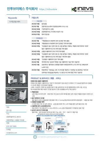 %ub300%ud45c %uc815 %uc758 %ucca0%uc8fc%uc18c%uac15%uc6d0%ud2b9%ubcc4%uc790%uce58%ub3c4 %ucd98%ucc9c%uc2dc%uac15%uc6d0%ub300%ud559%uae38 1, %ubcf4%ub4ec%uad00 1106%ud638%uc804%ud654033-257-3835%uc774%uba54%uc77cceo@in2vs.com%uae30%uc5c5%uc18c%uac1cPRODUCT & SERVICE | %uc81c%ud488%u00b7%uc11c%ube44%uc2a4%uc778%ud22c%ube0c%uc774%uc5d0%uc2a4 %uc8fc%uc2dd%ud68c%uc0ac https://in2vs.storeKeywords32 2025%uac15%uc6d0%ub300%ud559%uad50%uac15%uc6d0%ucc3d%uc5c5%ubcf4%uc721%uc13c%ud130%uc785%uc8fc%uae30%uc5c5 %uc18c%uac1c%uc11c%ub514%uc9c0%ud138 %ud5ec%uc2a4%ucf00%uc5b4%uc778%uccb4%ubaa8%uc0ac%ud615 %uc2ec%ud608%uad00 %uc2dc%ubbac%ub808%uc774%ud130%uc778%uccb4%ubaa8%uc0ac%ud615 %uc2ec%ud608%uad00 %uc2dc%ubbac%ub808%uc774%ud130%ub294 %uc758%ub8cc%uae30%uae30 %uc81c%uc870%uc5c5%uccb4%uac00 %uc784%uc0c1%uc2dc%ud5d8 %uc804 %ub2e8%uacc4%uc5d0%uc11c %uae30%uae30 %uc131%ub2a5%uc744 %uc815%ub7c9%uc801%uc73c%ub85c %uac80%uc99d%ud560 %uc218 %uc788%ub3c4%ub85d %uac1c%ubc1c%ub41c %uc0ac%uc804%uc778%uc99d%ud3c9%uac00 %ud50c%ub7ab%ud3fc%uc2a4%ud150%ud2b8, %uc778%uacf5%ud310%ub9c9, %uce74%ud14c%ud130 %ub4f1 %uc0bd%uc785%ud615 %uc758%ub8cc%uae30%uae30%ub97c %uc2e4%uc81c %ud658%uc790%uc640 %uc720%uc0ac%ud55c %ud608%ub958%ud658%uacbd%uc5d0%uc11c %ubc18%ubcf5 %uc2dc%ud5d8, %ub0b4%uad6c%uc131 %ud14c%uc2a4%ud2b8%ub4f1%uc744 %ud1b5%ud574 %uac1c%ubc1c %ube44%uc6a9%uacfc %uae30%uac04%uc744 %uc808%uac10%ud558%uace0 %uc778%uc99d %uc131%uacf5%ub960%uc744 %ub192%uc774%ub294 %ud575%uc2ec %uc194%ub8e8%uc158%uae30%uc5c5 %uc5f0%ud6012023%ub144 10%uc6d42023%ub144 11%uc6d42024%ub144 06%uc6d42024%ub144 09%uc6d42025%ub144 07%uc6d4%ubc95%uc778%uc124%ub9bd%uac15%uc6d0%uc9c0%ubc29 %uc911%uc18c%ubca4%ucc98%uae30%uc5c5%uccad%uc7a5%uc0c1(%uc608%ube44-%uc6b0%uc218) %uc218%uc0c1%uae30%uc5c5%ubd80%uc124%uc5f0%uad6c%uc18c %uc124%ub9bd%uac15%uc6d0%ud2b9%ubcc4%uc790%uce58%ub3c4 %uc9c0%uc2dd%uc7ac%uc0b0 %uc720%uacf5%uc790 %uc218%uc0c1%ubca4%ucc98%uae30%uc5c5%uc778%uc99d%uc9c0%uc801%uc7ac%uc0b0%uad8c2023%ub144 11%uc6d42024%ub144 06%uc6d42024%ub144 07%uc6d42024%ub144 07%uc6d42024%ub144 09%uc6d42024%ub144 10%uc6d42024%ub144 11%uc6d42024%ub144 12%uc6d42024%ub144 01%uc6d4%u2018%u201c%ub9e5%ub3d9%ud615%ud38c%ud504%uc758 %uc720%ub7c9%uc81c%uc5b4 %uc7a5%uce58 %ubc0f %ubc29%ubc95%u201d %ud2b9%ud5c8 %ucd9c%uc6d0%u201c%ub9e5%ub3d9%ud615%ud38c%ud504%uc758 %uc720%ub7c9%uc81c%uc5b4 %uc7a5%uce58 %ubc0f %ubc29%ubc95%u201d %uad6d%uc81c %ud2b9%ud5c8 %ucd9c%uc6d0%u201c%uc778%uacf5%ud608%uad00%uc758 %ucd9c%uad6c %uc555%ub825 %uc13c%uc2f1 %ubc0f %uc870%uc808 %ub3d9%uc791%uc744 %uc218%ud589%ud558%ub294 %ub9e5%ub3d9%ud615 %uc720%ub7c9 %uc81c%uc5b4%uc5d0 %uae30%ubc18%ud55c %ud608%uad00 %uc2dc%ubbac%ub808%uc774%ud130 %ubc0f %uc774%uc758 %uc81c%uc5b4 %ubc29%ubc95%u201d %ud2b9%ud5c8 %ucd9c%uc6d0%uc2ec%ud608%uad00%uc2dc%ubbac%ub808%uc774%ud130 %ub2e8%ub3c5 %ub514%uc790%uc778 %ud2b9%ud5c8 %ucd9c%uc6d0%u201c%uc778%uacf5%ud608%uad00%uc758 %ucd9c%uad6c %uc555%ub825 %uc13c%uc2f1 %ubc0f %uc870%uc808 %ub3d9%uc791%uc744 %uc218%ud589%ud558%ub294 %ub9e5%ub3d9%ud615 %uc720%ub7c9 %uc81c%uc5b4%uc5d0 %uae30%ubc18%ud55c %ud608%uad00 %uc2dc%ubbac%ub808%uc774%ud130 %ubc0f %uc774%uc758 %uc81c%uc5b4 %ubc29%ubc95%u201d %uad6d%uc81c %ud2b9%ud5c8 %ucd9c%uc6d0%u201c%uc778%uacf5%ud608%uad00 %uc2dc%ubbac%ub808%uc774%ud130 %uc7a5%uce58%u201d %ud2b9%ud5c8 %ucd9c%uc6d0%ucf00%uc774%uba54%ub514%ud5c8%ube0c %u201c%uc2b9%ubaa8%ud310 %uc5ed%ub958%uc99d %uc218%uc220 %uc2dc%ubbac%ub808%uc774%ud130 %uae30%uc220%u201d %ud2b9%ud5c8 %uae30%uc220%uc774%uc804%uac15%uc6d0%ub300%ud559%uad50 %u201c%ubb3c%ub9ac%uc815%ubcf4 %uc2e0%uacbd%ub9dd%uc744 %uc774%uc6a9%ud55c %uc758%ub8cc%uc601%uc0c1%ub370%uc774%ud130 %ub178%uc774%uc988 %uc81c%uac70 %ubc0f %uace0%ud574%uc0c1%ub3c4%ud654%u201d %ub178%ud558%uc6b0 %uc774%uc804%ud55c%ub9bc%ub300%ud559%uad50 %u201c%uc758%ub8cc%uc2e4%uc2b5 %uad50%uc721 %uc2dc%ub098%ub9ac%uc624%ub97c %uc81c%uacf5%ud558%uace0 %uac00%uc0c1%ud604%uc2e4 %ubc0f %uc99d%uac15%ud604%uc2e4 %uae30%ubc18%uc73c%ub85c %uc0c1%ud638%uc791%uc6a9 %uc758%ub8cc%uc2e4%uc2b5%uc744 %uc81c%uacf5%ud558%ub294 %uc2dc%uc2a4%ud15c %ubc0f %uc774%uc758 %uc81c%uc5b4 %ubc29%ubc95%u201d %ud2b9%ud5c8 %uae30%uc220%uc774%uc8041. %ub9e5%ub3d9%ud615 %ud38c%ud504 %uc2ec%uc7a5 %ubc15%ub3d9%uacfc %uc720%uc0ac%ud55c %uc555%ub825%u00b7%uc720%ub7c9 %ud30c%ud615 %uad6c%ud604, %ud38c%ud504%uc758 BPM %uc81c%uc5b4%ub97c %ud1b5%ud55c %uc2ec%ubc15 %uc870%uc808%uacfc %ubc15%ucd9c%ub7c9 %uc870%uc808%ub85c %ub2e4%uc591%ud55c %uc870%uac74 %uad6c%ud6042. %ucd9c%uad6c %uc555%ub825%ubaa8%uc0ac %uc2dc%uc2a4%ud15c %ud608%uad00 %ucd9c%uad6c%uc758 %uc555%ub825 %uc870%uc808%uc744 %ud1b5%ud55c %uc815%ubc00 %ud608%ub958 %uad6c%ud604, %u00b11 mmHg %uc815%ubc00 %uc81c%uc5b4%ub85c %ubcd1%ub9ac%ud559%uc801 %ud658%uacbd(%ud611%ucc29%u00b7%uace0%ud608%uc555 %ub4f1) %uc7ac%ud6043. %ub9de%ucda4%ud615 %uc778%uacf5%ud608%uad00 %uc81c%uc791 CT/MRI %uc601%uc0c1 %uae30%ubc18 3D %uc124%uacc4, %uc810%ud0c4%uc131%u00b7%uc21c%uc751%ub3c4%ub97c %ubc18%uc601%ud55c %ud2b9%uc218 %uc18c%uc7ac %uc801%uc6a9%uc744 %ud1b5%ud55c %uc2e4%uc81c %ud608%uad00 %ubc18%uc751 %uad6c%ud6044. %ud608%ub958%uc5ed%ud559 %ubd84%uc11d %uc18c%ud504%ud2b8%uc6e8%uc5b4(CFD) %uc601%uc0c1 %ub370%uc774%ud130 %uae30%ubc18 %uc815%ubc00 %ubd84%uc11d, in-silico %ud574%uc11d%uacfc in-vitro %uc2e4%ud5d8 %uc5f0%ub3d9%uc744 %ud1b5%ud55c %ub514%uc9c0%ud138%ud2b8%uc708 %uac80%uc99d %uc9c0%uc6d05. %uc2e4%uc2dc%uac04 AR/VR %uac00%uc2dc%ud654 %ubaa8%ub4c8 %ud608%ub958 %ud30c%ud615%u00b7%uc555%ub825 %ubd84%ud3ec%ub97c %uc9c1%uad00%uc801%uc73c%ub85c %ud655%uc778 %uac00%ub2a5, %uad50%uc721%u00b7%uc5f0%uad6c%u00b7%uc758%ub8cc%uae30%uae30 %uac1c%ubc1c %uc9c0%uc6d0