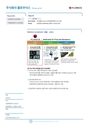 %ub300%ud45c %ud558 %ud638 %uc9c4%uc8fc%uc18c%uac15%uc6d0%ud2b9%ubcc4%uc790%uce58%ub3c4 %ucd98%ucc9c%uc2dc%uac15%uc6d0%ub300%ud559%uae38 1, %ubcf4%ub4ec%uad00 905%ud638%uc804%ud654%uc774%uba54%uc77chojinha@kangwon.ac.kr%uae30%uc5c5%uc18c%uac1cPRODUCT & SERVICE | %uc81c%ud488%u00b7%uc11c%ube44%uc2a4%uc8fc%uc2dd%ud68c%uc0ac %ud50c%ub85c%uc6b0%ub2c9%uc2a4 flonics.co.krKeywords42 2025%uac15%uc6d0%ub300%ud559%uad50%uac15%uc6d0%ucc3d%uc5c5%ubcf4%uc721%uc13c%ud130%uc785%uc8fc%uae30%uc5c5 %uc18c%uac1c%uc11c%uc720%uccb4%uc5ed%ud559 %uc18c%ud504%ud2b8%uc6e8%uc5b4 %uae30%uc5c5 %uc5f0%ud601%uacfc%uae30%uc815%ud1b5%ubd80 4D flow MRI %ud608%ub958%uc5ed%ud559%ubd84%uc11d %uc5f0%uad6c %uc218%ud589%uac15%uc6d0%ub300%ud559%uad50 %uc720%uccb4%uc5ed%ud559%uc5f0%uad6c%uc2e4%uc5d0%uc11c %uc2a4%ud540%uc624%ud504 %ucc3d%uc5c54D flow MRI %uc758%ub8cc%uc601%uc0c1 %ubd84%uc11d %uc18c%ud504%ud2b8%uc6e8%uc5b4%u25a1 4D Flow MRI : %ud608%ub958 %uc5ed%ud559 %uc815%ubcf4%uc758 %uac00%uc2dc%ud654 %uc18c%ud504%ud2b8%uc6e8%uc5b4 - MRI %uc601%uc0c1 %ub370%uc774%ud130%ub97c %uae30%ubc18%uc73c%ub85c %uc2ec%ud608%uad00, %ub1cc%ud608%uad00%uc758 %ud608%ub958 %uc815%ubcf4 %uac00%uc2dc%ud654(Visualization) %uc218%ud589 - %uc9c4%ub2e8%uc9c0%ud45c%ub4e4%uc758 %uc815%ub7c9%ud654(Quantification) %uc218%ud589 %u25a1 MRI %ub300%uc751 %ud6c4%ucc98%ub9ac SW - Philips, Siemens, GE %ub4f1 %ub2e4%uc591%ud55c MRI %uae30%uae30%uc5d0%uc11c %ucd2c%uc601%ub418%ub294 %uc601%uc0c1 %ub370%uc774%ud130%ub97c %uc720%uccb4%uc5ed%ud559%uc801%uc73c%ub85c %ubb3c%ub9ac%uc801%uc778 %uac12%uc73c%ub85c %uc790%ub3d9 %ubcc0%ud658 %u2192 %ud608%ub958 %ubd84%uc11d %uc218%ud589 %u25a1 %uc601%uc0c1%uc758%ud559%uacfc, %uc2ec%uc7a5%ub0b4%uacfc, %uc21c%ud658%uae30%ub0b4%uacfc, %uc2e0%uacbd%uacfc %ub4f1 %ud608%ub958 %ubd84%uc11d %ubc0f %uc9c4%ub2e8%uc6a9 %uc0ac%uc6a92014-2024%ub144%uc758%ub8cc%uc601%uc0c1%ubd84%uc11d %uc18c%ud504%ud2b8%uc6e8%uc5b4 2024%ub144