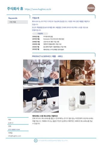 08 2025%uac15%uc6d0%ub300%ud559%uad50%uac15%uc6d0%ucc3d%uc5c5%ubcf4%uc721%uc13c%ud130%uc878%uc5c5%uae30%uc5c5 %uc18c%uac1c%uc11c%ub808%ubc84%ud504%ub808%uc18c (%uc218%ub3d9 %uc5d0%uc2a4%ud504%ub808%uc18c %ucd94%ucd9c%uba38%uc2e0)%uc5b8%uc81c %uc5b4%ub514%uc11c%ub098 %uc5d0%uc2a4%ud504%ub808%uc18c%ub97c %uc990%uae38 %uc218 %uc788%uac8c %ud574%uc8fc%ub294 %uc804%uae30%uac00 %ud544%uc694 %uc5c6%ub294 %uc790%uc5f0%uce5c%ud654%uc801 %uc218%ub3d9 %uc5d0%uc2a4%ud504%ub808%uc18c %ucd94%ucd9c%uae30%uc785%ub2c8%ub2e4. %uce74%ud398%uc5d0%uc11c %ub9c8%uc2dc%ub294 %ud488%uc9c8%uc758 %ud22c%uc0f7%uc758 %ub18d%ud6c4%ud558%uace0 %ub9e4%ub825%uc801%uc778 %ud06c%ub808%ub9c8%uc758 %uc5d0%uc2a4%ud504%ub808%uc18c%ub97c %ub9cc%ub0a0 %uc218 %uc788%uc2b5%ub2c8%ub2e4.%ub300%ud45c %uae40 %ud604 %uc218%uc804%ud654070-8888-4344%uc774%uba54%uc77cinfo@hughinc.com%uae30%uc5c5%uc18c%uac1cPRODUCT & SERVICE | %uc81c%ud488%u00b7%uc11c%ube44%uc2a4%uc8fc%uc2dd%ud68c%uc0ac %ud734 https://www.hughinc.co.kr%ud734(HUGH.)%ub294 %uc720%uae30%uc801%uc778 %ub514%uc790%uc778%uacfc %uae30%ub2a5%uc131%uc5d0 %uad00%uc2ec%uc744 %uac16%uace0, %ub2e4%uc591%ud55c %ucee4%ud53c %uad00%ub828 %uc81c%ud488%uc744 %uac1c%ubc1c%ud558%uace0 %uc788%uc2b5%ub2c8%ub2e4.%ub2f9%uc2e0%uc758 %ud2b9%ubcc4%ud568%uc744 %ub3cb%ubcf4%uc774%uac8c %ud574%uc904 %ud734%uc758 %uc81c%ud488%ub4e4%uc740 %uc804%uc138%uacc4 %uc720%uc800%uc758 %ud53c%ub4dc%ubc31%uacfc %ub2c8%uc988%ub97c %uae30%ubc18%uc73c%ub85c %ub9cc%ub4e4%uc5b4%uc9d1%ub2c8%ub2e4.2016%ub144 5%uc6d42017%ub144 11%uc6d42018%ub144 11%uc6d42020%ub144 4%uc6d42021%ub144 7%uc6d42022%ub144 1%uc6d4Keywords%uae30%uc5c5%uc5f0%ud601%ub9ac%ube59 %uc81c%ud488%uc8fc%uc2dd%ud68c%uc0ac%ud734 %uc124%ub9bdKickstarter 150,000USD %ud380%ub529 %ub2ec%uc131%uc2e0%ubcf4 %ud37c%uc2a4%ud2b8 %ud3ad%uadc4 %uae30%uc5c5 %uc120%uc815%ub300%ud55c%ubbfc%uad6d %uba85%ud488%ube0c%ub79c%ub4dc %ub300%uc0c1 %uc218%uc0c1%uc911%uc18c%ubca4%ucc98%uae30%uc5c5%ubd80 %uc218%ucd9c%uc720%ub9dd%uc911%uc18c%uae30%uc5c5 %uc9c0%uc815%ub808%ubc84%ud504%ub808%uc18c %ub204%uc801 %ud310%ub9e4%ub7c9 2%ub9cc%ub300 %ub3cc%ud30c