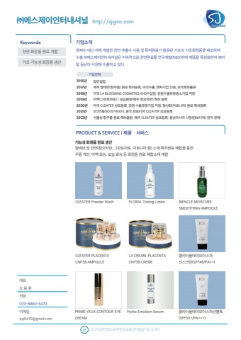 16 2025%uac15%uc6d0%ub300%ud559%uad50%uac15%uc6d0%ucc3d%uc5c5%ubcf4%uc721%uc13c%ud130%uc878%uc5c5%uae30%uc5c5 %uc18c%uac1c%uc11c%ub300%ud45c %uc624 %uc6a9 %ud658%uc804%ud654070-8860-6479%uc774%uba54%uc77csjsj6479@gmail.com%uae30%uc5c5%uc18c%uac1cPRODUCT & SERVICE | %uc81c%ud488%u00b7%uc11c%ube44%uc2a4%u321c%uc5d0%uc2a4%uc81c%uc774%uc778%ud130%ub0b4%uc154%ub110 http://sjsjinc.com%uc815%uc81c%uc218 %ub300%uc2e0 %uc790%uccb4 %uac1c%ubc1c%ud55c %ucc9c%uc5f0 %ucd94%ucd9c%uc218 %uc0ac%uc6a9 %ubc0f %ud2b9%ud5c8%uc6d0%ub8cc%uac00 %ud568%uc720%ub41c %uae30%ub2a5%uc131 %uae30%ucd08%ud654%uc7a5%ud488%uc744 %uc81c%uc870%ud558%uc5ec %uc218%ucd9c %u321c%uc5d0%uc2a4%uc81c%uc774%uc778%ud130%ub0b4%uc154%ub110%uc740 %uc9c0%uc18d%uc801%uc73c%ub85c %ucc9c%uc5f0%uc6d0%ub8cc%ub97c %uc5f0%uad6c%uac1c%ubc1c(R&D)%ud558%uba70 %uc81c%ud488%uc744 %ud2b9%uc131%ud654%ud558%uc5ec %ubd81%ubbf8 %ubc0f %ub3d9%ub0a8%uc544 %uc2dc%uc7a5%uc5d0 %uc218%ucd9c%ud558%uace0 %uc788%ub2e4.2016%ub1442017%ub1442018%ub1442019%ub1442020%ub1442021%ub1442022%ub144Keywords%uae30%uc5c5%uc5f0%ud601%ucc9c%uc5f0 %ud654%uc7a5%ud488 %uc6d0%ub8cc %uac1c%ubc1c%uae30%ucd08 %uae30%ub2a5%uc131 %ud654%uc7a5%ud488 %uc0dd%uc0b0%ubc95%uc778%uc124%ub9bd%uc81c%uc8fc %ub9d0%ud0dc%ubc18(%ud56d%uc8fc%ub984) %uc6d0%ub8cc %ud2b9%ud5c8%ub4f1%ub85d, %ubbf8%uad6d%uc218%ucd9c, %ubca4%ucc98%uae30%uc5c5 %uc778%uc99d, %ubbf8%uad6d%ud2b9%ud5c8%ucd9c%uc6d0%ubbf8%uad6d LA BLOOMING COSMETICS SHOP %uc785%uc810, %uac15%uc6d0%uc218%ucd9c%uc720%ub9dd%uc911%uc18c%uae30%uc5c5 %uc9c0%uc815%ubbf8%ubc31(%uadf8%ub9b0%ud1a0%ub9c8%ud1a0) / %ubcf4%uc2b5%uc6d0%ub8cc(%uc81c%uc8fc %ucc38%ubaa8%uc790%ubc18) %ud2b9%ud5c8 %ub4f1%ub85d%ubbf8%uad6d CLEATER %uc0c1%ud45c%ub4f1%ub85d, %uac15%uc6d0 %uc218%ucd9c%uc720%ub9dd%uae30%uc5c5 %uc9c0%uc815, %ud56d%uc0b0%ud654(%uc544%ub85c%ub2c8%uc544) %uc6d0%ub8cc %ud2b9%ud5c8%ub4f1%ub85dISO%uc778%uc99d(9001/14001), %uc911%uad6d %uce84%ubcf4%ub514%uc544 CLEATER %uc0c1%ud45c%ub4f1%ub85d%uc2dd%ubb3c%uc131 %ud56d%uc8fc%ub984 %uc6d0%ub8cc %ud2b9%ud5c8%ucd9c%uc6d0, %ud0dc%uad6d CLEATER %uc0c1%ud45c%ub4f1%ub85d, %ub3d9%ub0a8%uc544%uc2dc%uc544 %uc2dc%uc7a5(%uce84%ubcf4%ub514%uc544) %ud604%uc9c0 %ud310%ub9e4%uae30%ub2a5%uc131 %ud654%uc7a5%ud488 %uc6d0%ub8cc %uc0dd%uc0b0%ub9d0%ud0dc%ubc18 %ubc0f %ucc9c%uc5f0(%ucc38%ubaa8%uc790%ubc18, %uadf8%ub9b0%ud1a0%ub9c8%ud1a0. %uc544%ub85c%ub2c8%uc544 %ub4f1) %uc18c%uc7ac %ud2b9%ud5c8%uc6d0%ub8cc %ubc30%ud569%uc744 %ud1b5%ud55c%uc8fc%ub984 %uac1c%uc120, %ubbf8%ubc31 %ud6a8%ub2a5, %ubcf4%uc2b5 %ud6a8%ub2a5 %ub4f1 %ud654%uc7a5%ud488 %uc6d0%ub8cc %ubcf5%ud569%uc18c%uc7ac %uac1c%ubc1cCLEATER Powder WashCLEATER PLACENTA CNP38 AMPOULEPRIME YEUX CONTOUR EYE CREAMFLORAL Toning LotionLA CREAM PLACENTA CNP38 CREMEHydra Emulsion SerumBIENCLE MOISTURE SMOOTHING AMPOULE%ud074%ub9ac%ud130%uc62c%ub370%uc774%ubaa8%uc774%uc2a4%uccd0%uc120%uc2a4%ud06c%ub9b0(SPF46/PA++)%ud074%ub9ac%ud130%uc62c%ub370%uc774%ubaa8%uc774%uc2a4%uccd0%uc120%ube14%ub85d(SPF50+/PA+++)